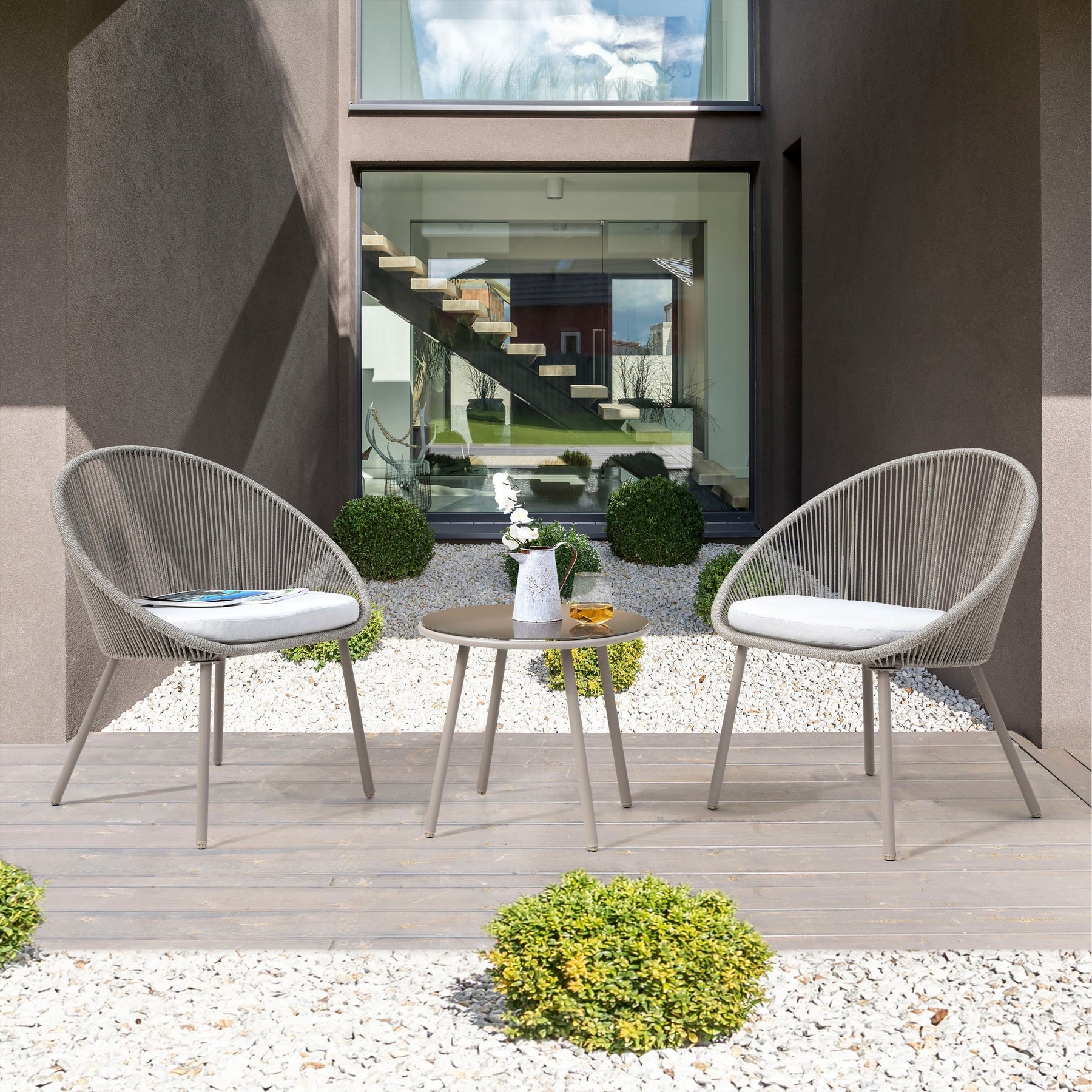 Perlita Outdoor Patio Set| Durable Garden Furniture-2 Chairs + 1 Table Grey Braided & Rope